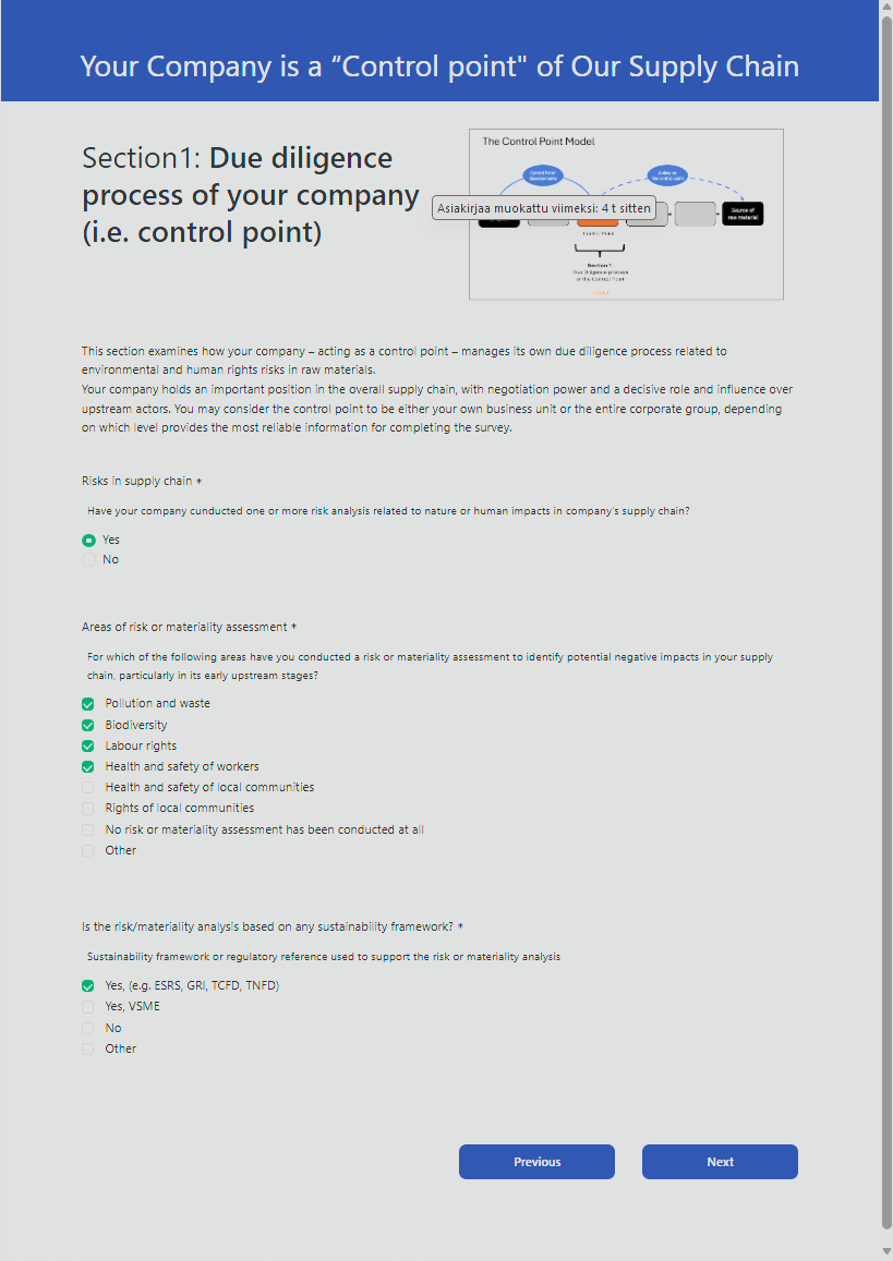 Ennen kysymysten laatimista arvioidaan toimitusketjun yritysten kestävyysraportteja ja muita julkisia tietoja kestävyyteen liittyen. Arviointi tehdään hyödyntämällä DueSight -ohjelmaa. Kestävyysraportteja hyödyntäen moni kestävyysseikka saadaan analysoitua nopeasti ja kysymysten määrää voidaan mahdollisesti vähentää merkittävästi. Työssä on käynyt selväksi, että globaalilla markkinalla toimivien yritysten välillä on erittäin suuria eroja siinä, miten ja missä laajuudessa ne julkistavat kestävyystietojaan. Nostaako tavanomaisten kestävyystietojen puuttuminen yrityksen riskitasoa niin paljon, että asiakas kaukana arvoketjussa joutuu lähettämään erittäin laajan kysymyspatteriston? Kuva 3. DueSight ohjelman testausta osana pilotointia: merkittävät erot arvoketjuun hallintaan liittyvien kestävyystietojen julkaisussa. Kysymysrunko on rakennettu modulaarisesti siten, että se kattaa yleiset, kaikille rakennustuotteille yhteiset kysymykset sekä sektorikohtaiset ja raaka-ainekohtaiset kysymykset. Kaikki kysymysrunkoon päätyvät selvitettävät asiat ovat jo aiemmin julkaistu jossakin kansainvälisessä viitekehyksessä. Kysymykset on virtaviivaistettu nopean vastaamisen mahdollistamiseksi. Toimitusketjuissa olevien sertifikaattien ja standardien avulla saadaan yleiskuva riskienhallinnan tasosta, mutta koska sertifikaattien vaatimustaso vaihtelee paljon, on lisäksi mukana vaikeitakin kysymyksiä: esimerkiksi raaka-aineiden (neitseellinen / kierrätetty) alkuperämaihin liittyvät kysymykset. Kuva 4. Ote kontrollipistekyselyn kysymyksistä (testattu yhtä lomakeohjelmistoa). Kysymykset päätettiin laatia Formsilla, Pilotointi käynnistyi marraskuun alussa ja osallistuville yrityksille luovutetaan kaikkien pilottien tulokset (kuratoituina) helmikuussa 2026. Yritykset pääsevät hyödyntämään menetelmää konkreettisien työkalujen avulla heti keväällä 2026.
